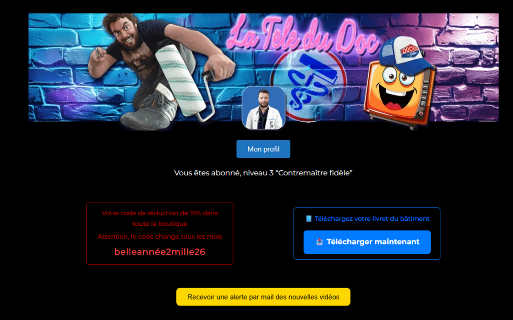 Sans censure, avec accès anticipé, accédez à un ensemble de vidéos inédites ainsi qu’à un bouquet de vidéos tuto sans publicité et téléchargeables (pratique pour suivre les vidéos sur chantier quand on n’a pas Internet).