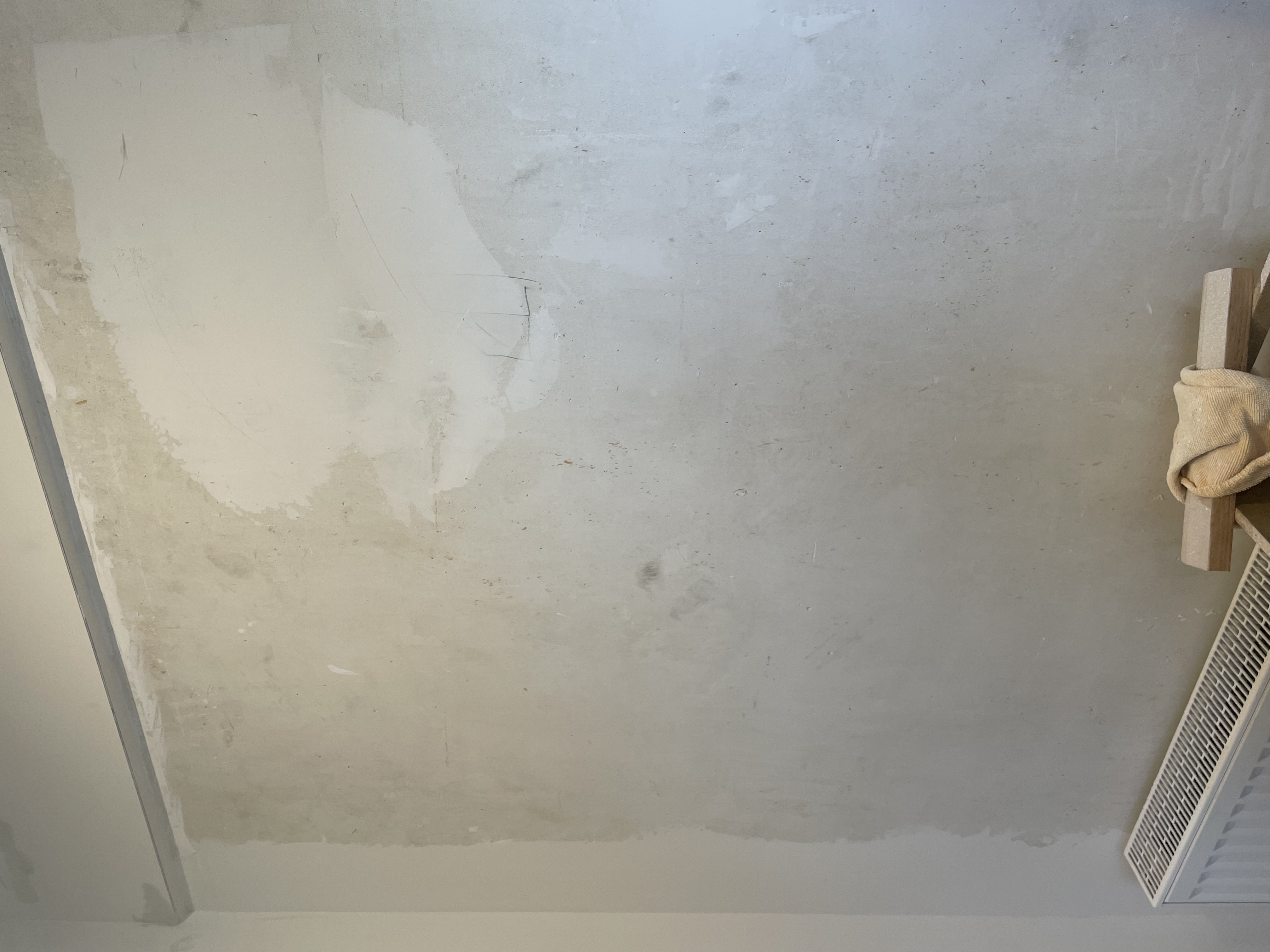 Juste à un endroit il y a un ventre, sur une longueur (un passage de gaine) l’électricien a comblé avec un mortier colle j’imagine, c’est blanc cassé/jaunatre et ça ne se ponce pas vraiment. J’avais commencé à gratter, mais je peux pas trop car on commence à voir la gaine. Je vais essayer d’adoucir ce bourrelet