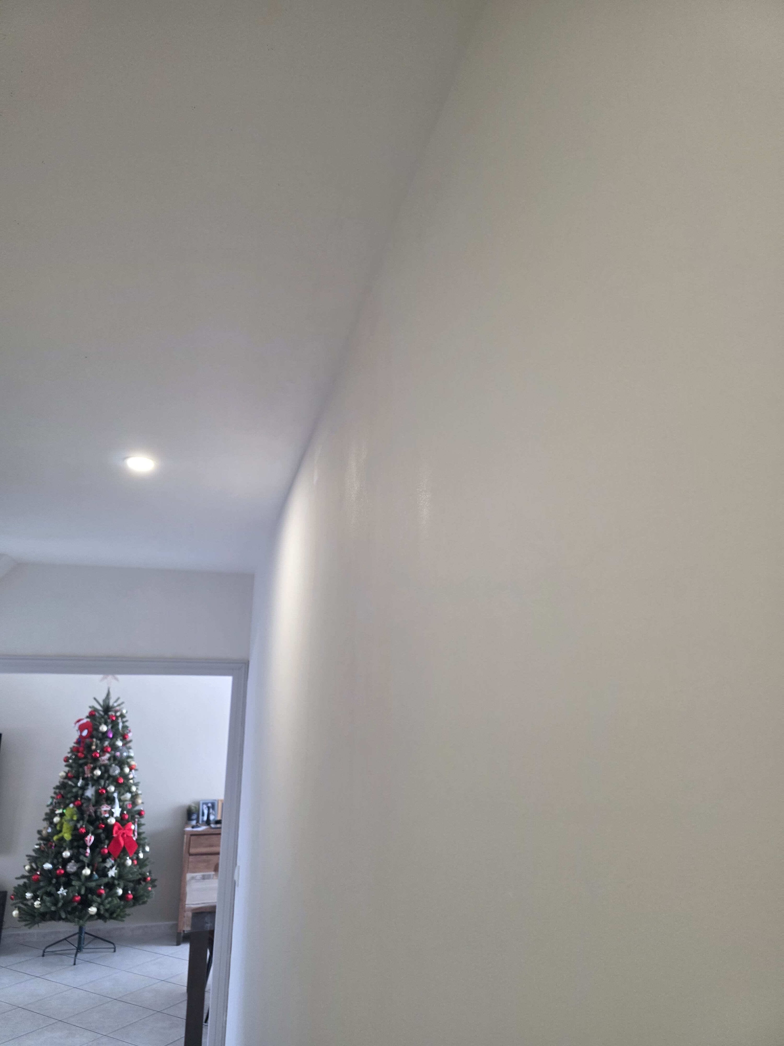 - Si vous aviez difficile d appliquer blanc sur blanc, il se peut qu il y ait des “passage” ou manque d ou certaines différences dans ce cas il faut être plus régulier et bien chevauché les bandes puis prendre 1 ou 2 secondes pour vérifier que l application est homogène en regardant à ras du mur ( brillance de la peinture appliquée avant qu elle ne sèche et plus facile avec un petit phare de chantier en lumière rasante .