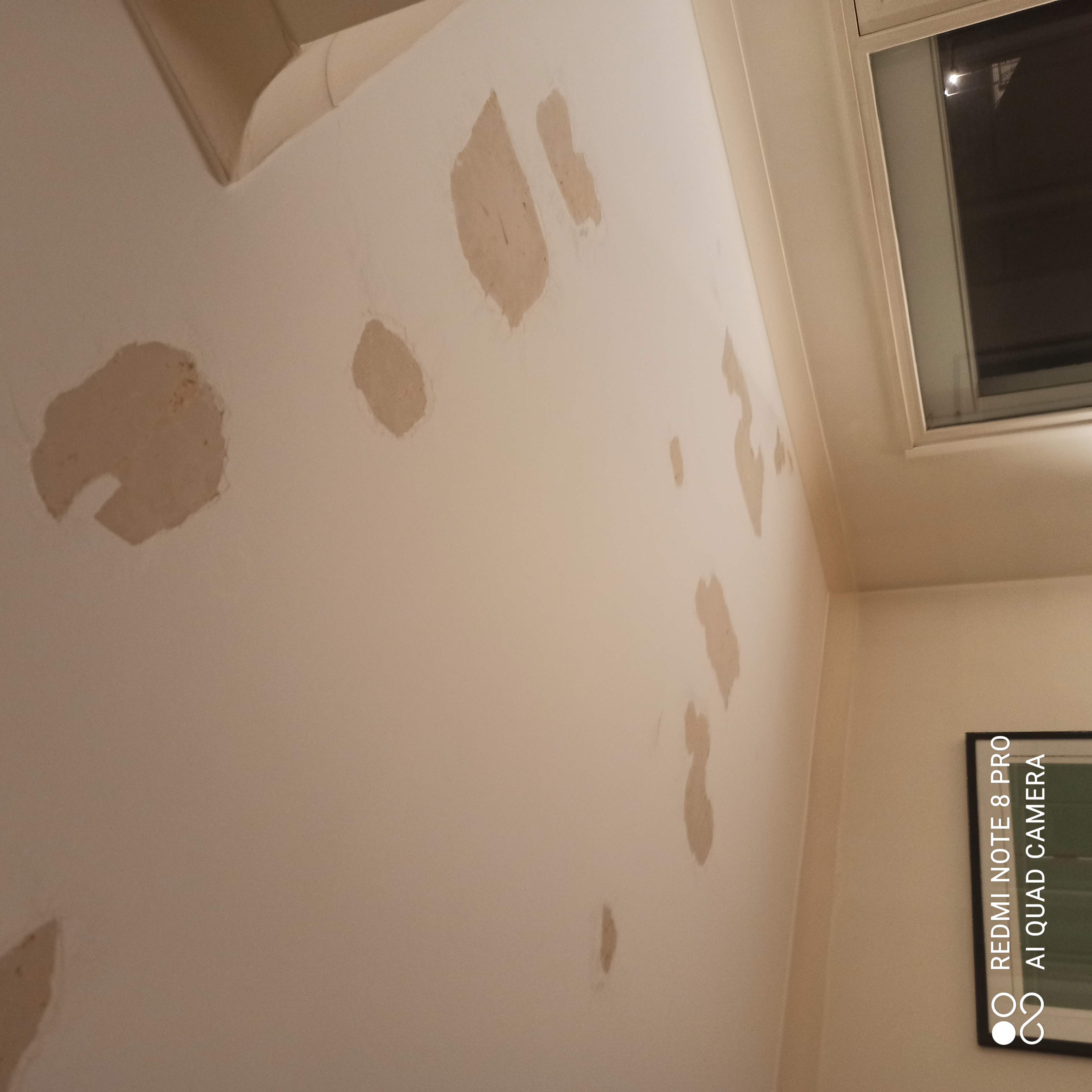 dans une petite chambre situé au premier étage sous les combles, le plafond est en placo et s’est écaillé il y a un an suite à des infiltrations qui provenaient des combles (sur un velux non étanche)